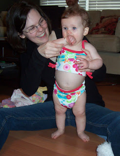 Starting last week, Addie decided she didn't want to eat very much. We let it go on for a couple of days, thinking she was just more interested in playing. Well, after it had been 3 days, I called the pediatrician and they suggested that it was probably her getting a new tooth. Sure enough, she was working on her fifth - the one to the left of her top teeth. It seemed just miserable for her! It has really taken its toll - she hasn't been herself at all. Luckily, it broke through Sunday and she already seems to feel about 250% better :) And her new tooth is cute!!